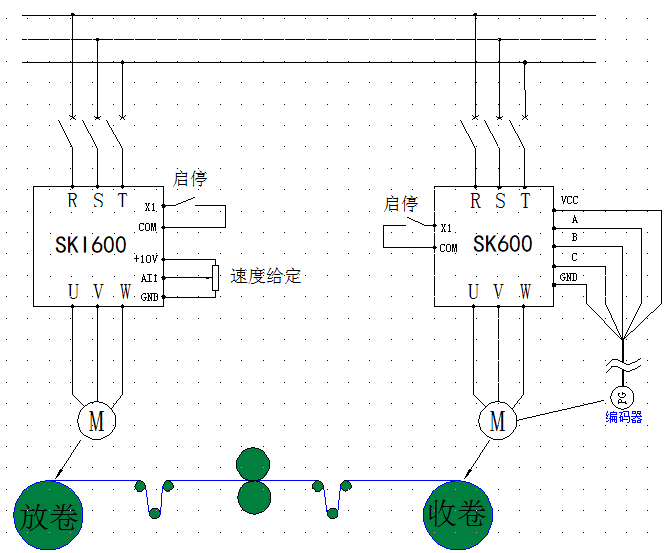 該現(xiàn)場放卷設(shè)備由1臺三科的SKI600-2D2G-1驅(qū)動一臺2.2KW電機進行速度控制,收卷設(shè)備則由1臺SKI600-3D7G-1驅(qū)動一臺3.7KW電機進行力矩控制。另外,在收卷部分的SKI600上加裝編碼器。