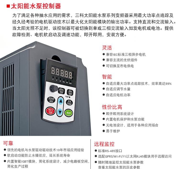易用性好:只需將太陽能板接入變頻器,通電后即可實現(xiàn)交流水泵自動啟動