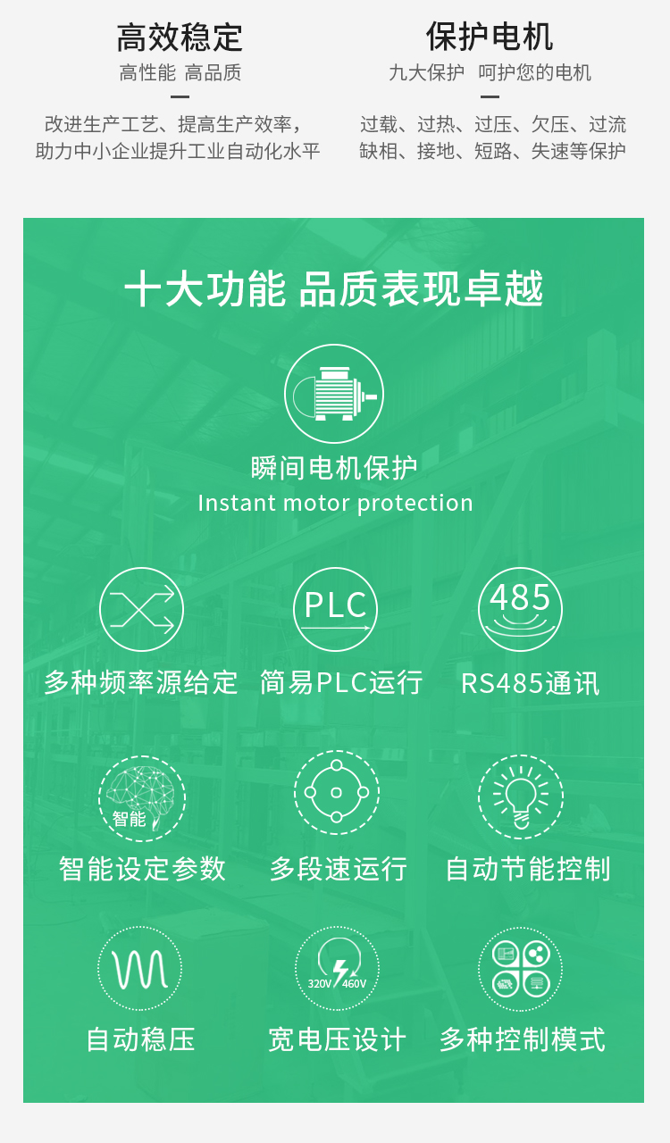 ⊙提供多種故障保護(hù)功能:過流、過壓、欠壓、過溫、缺相、過載等保護(hù)功能