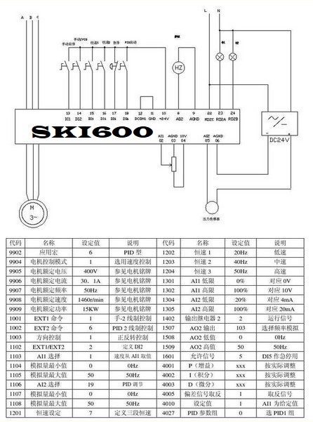 一,設(shè)計(jì)思路:選用一臺(tái) 15KW 具有 PID 功能的變頻器,可以不考慮輸入電抗器,電機(jī)速度由設(shè)定頻率與泵出口壓力作比較進(jìn)行 PID 調(diào)節(jié),設(shè)計(jì)應(yīng)考慮能手 /自動(dòng)轉(zhuǎn)換。