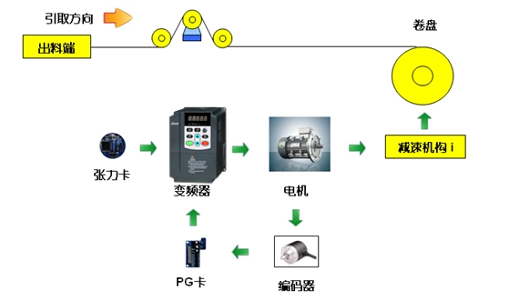 如下圖所示,收卷的恒張力控制,是按照工藝將系統收卷所需的張力及空、滿盤卷徑設置到張力卡,張力卡根據運行線速度,計算出當前卷徑,進而得到收卷所需的轉矩并將其給到后再進行轉矩控制。在收卷過程中,系統可自動實時計算當前的卷徑,以保證收卷張力的恒定。同時系統張力錐度的設置可使材料較好的卷曲成型。