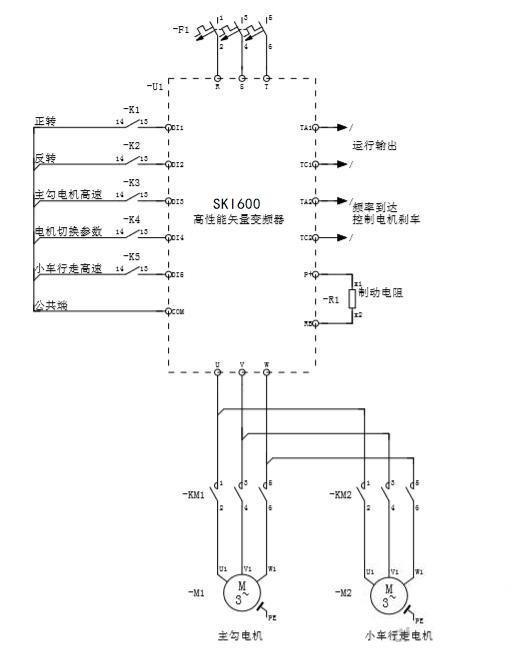 1.現(xiàn)場(chǎng)使用一臺(tái)三科生產(chǎn)的SKI600系列產(chǎn)品,用于控制兩臺(tái)電機(jī)