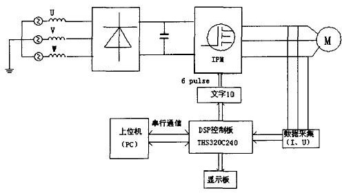 采用數(shù)字信號處理器作為控制器,可以減少外圍設(shè)備的數(shù)量,提高系統(tǒng)的穩(wěn)定性。在本設(shè)計中,主要使用了1MS32OC24Ox DSP的PWM輸出端口、板載A/D端口和捕獲接口CAP。DSP的六路PWM信號經(jīng)緩沖器反相后送到驅(qū)動電路板驅(qū)動IPM??刂葡到y(tǒng)結(jié)構(gòu)圖下所示。