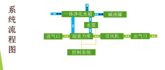 圖中:綠色箭頭代表廢氣走向,藍色箭頭代表水路線,細線代表控制線