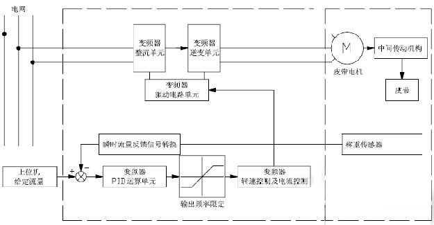 過流量設(shè)定及反饋,調(diào)節(jié)SKI600的輸出頻率以控制輸送皮帶的轉(zhuǎn)速,自動實(shí)現(xiàn)給料流程的精確控制和給料總量的準(zhǔn)確計(jì)量。SKI600流量PID閉環(huán)調(diào)節(jié)結(jié)構(gòu)圖如圖3 所示。