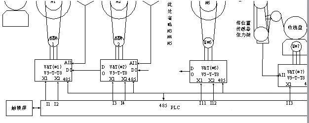 3、不銹鋼鍍鋅退火線拉絲機(jī):金屬絲經(jīng)過酸洗、加熱、鍍鋅等工藝,從退火爐出來之后,經(jīng)過牽引輪,再經(jīng)過一積絲盤,最后收卷。要求VFD具有高精度的開環(huán)轉(zhuǎn)矩控制性能,并且,換盤時(shí)要有積絲和退積功能,保證在高速整機(jī)在高速運(yùn)行進(jìn)行換盤無沖擊、不斷線。系統(tǒng)接線圖: